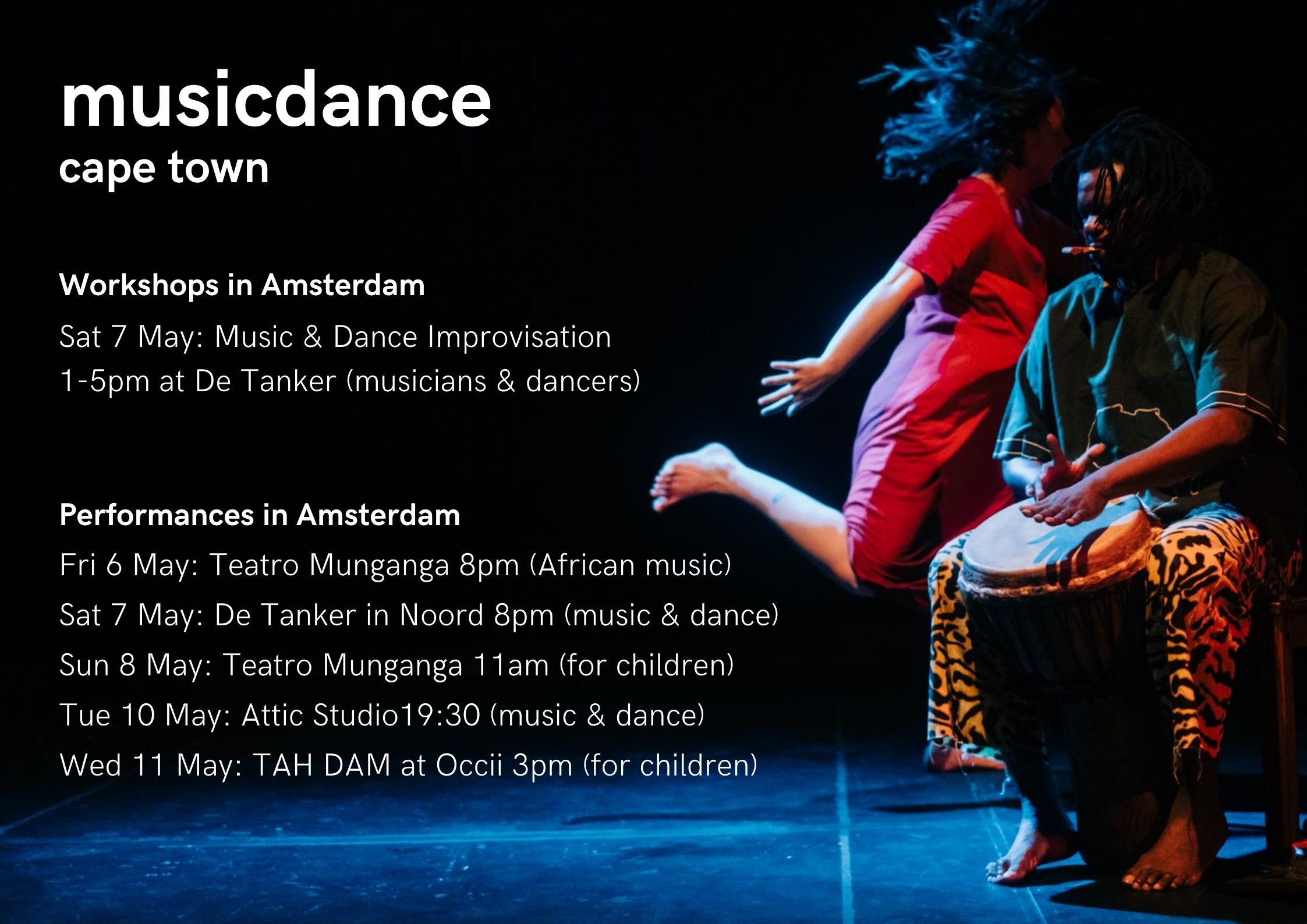 7 May @ de Tanker in Noord 20:00 Performance with MusicDance Cape Town ensemble and Amsterdam artists