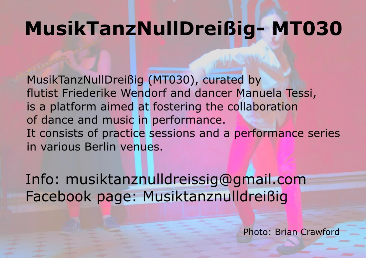 MusikTanzNullDreißig (MT030) is an initiative of flutist Friederike Wendorf and dancer Manuela Tessi.It is a platform aimed at fostering the collaboration of dance and music in performance.It consists of a performance series and practice sessions.